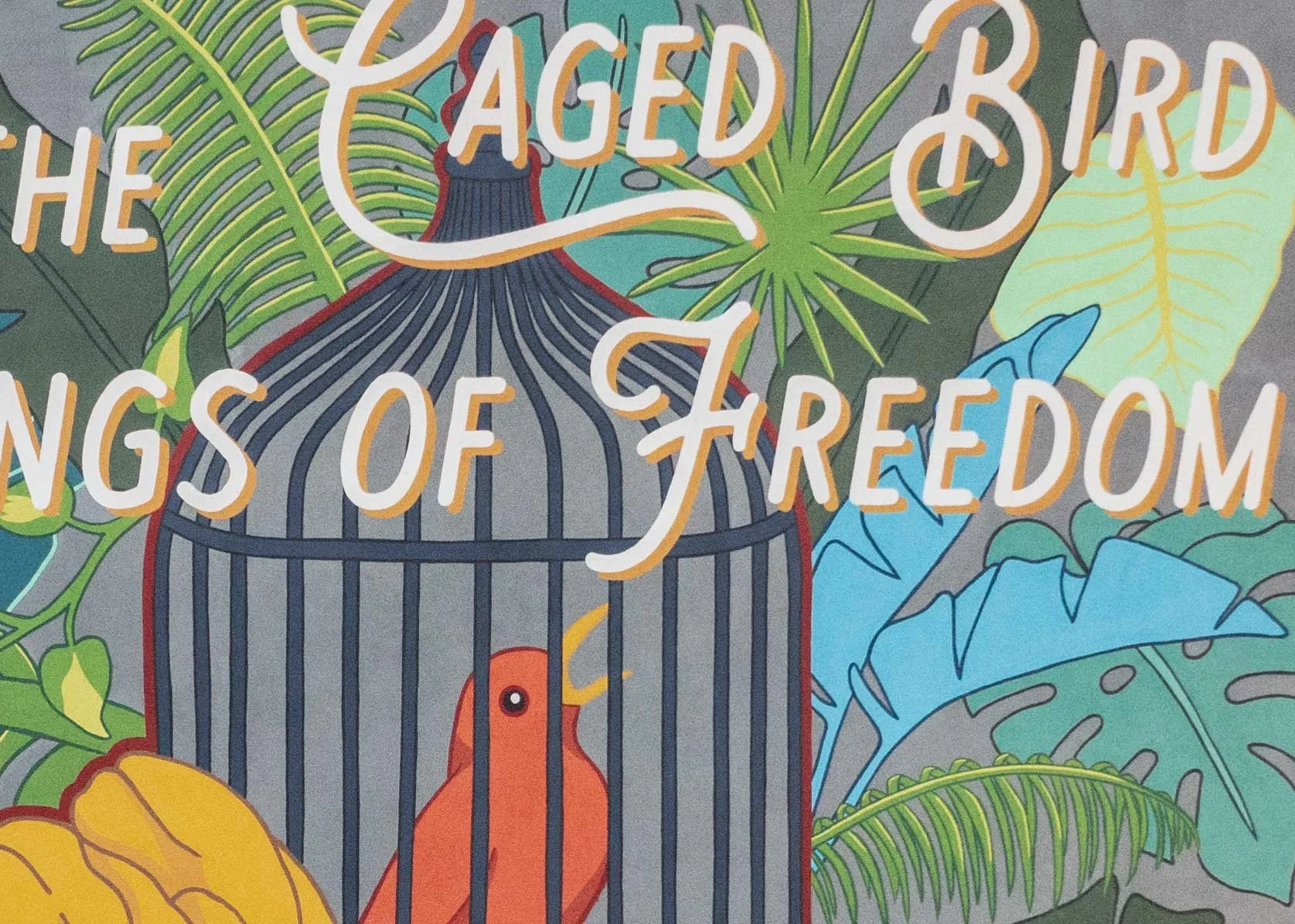 This concept was inspired by Maya Angelou’s famous “Caged Bird” poem. Just like in the poem, the bird is a symbol of the African-American experience, and the cage represents oppression and struggle. The cage also represents the flawed US justice system where African-Americans are incarcerated in state prisons at nearly five times the rate of white Americans (source). The Black woman surrounded by foliage is a symbol of mother nature and modern humans’ origins coming from Africa. The cage comes out of her head, to symbolize how deep the struggle for equality is for Black people.